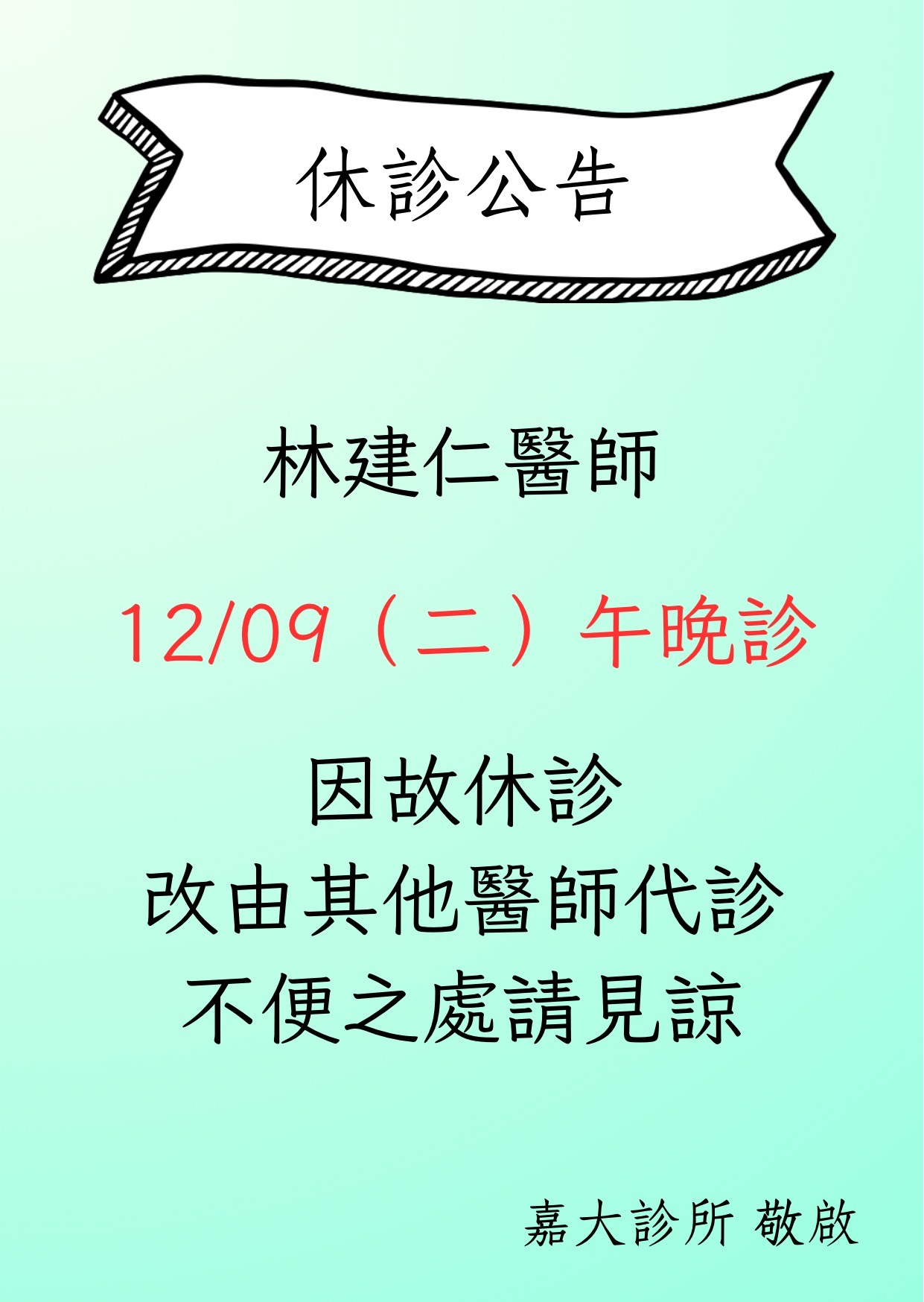 114/12/9林建仁醫師休診公告